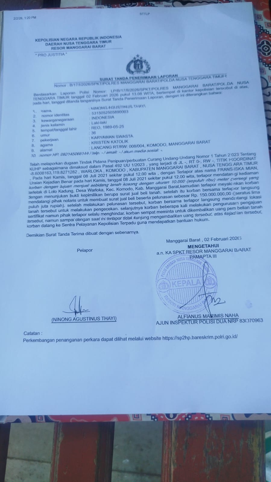 Bongkar Penipuan Tanah Di Warloka: Ninong Resmi Laporkan Dugaan Penipuan dan Pemalsuan Dokumen Tanah ke Polres Manggarai Barat